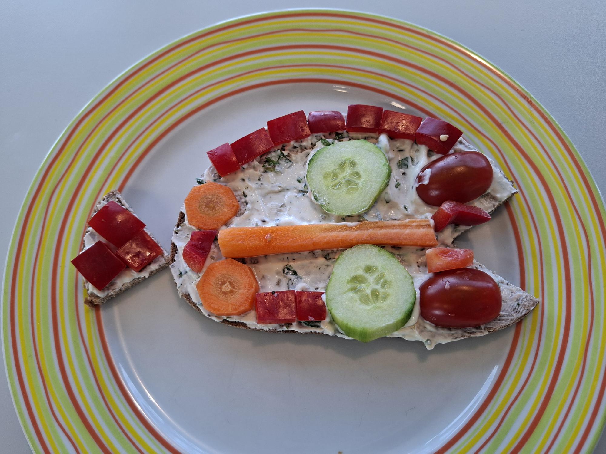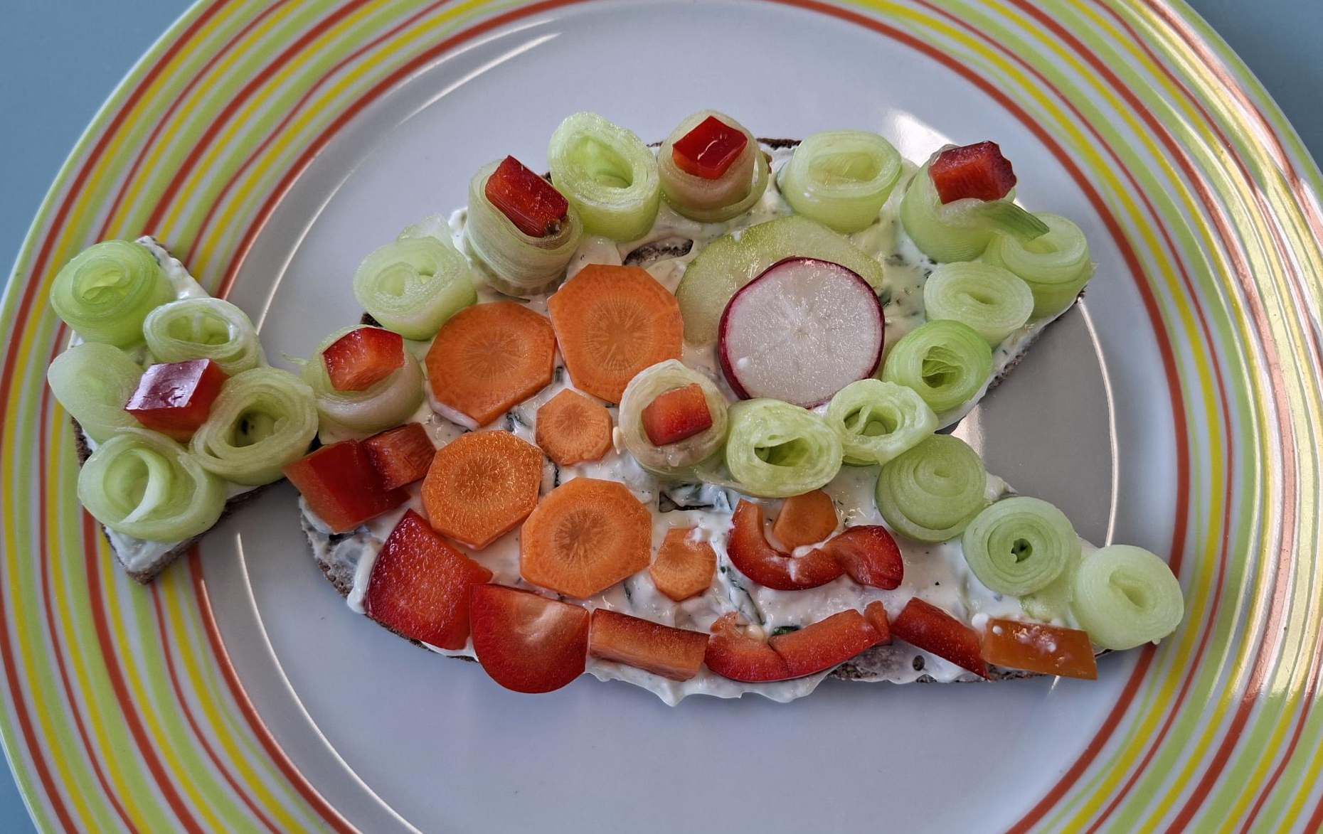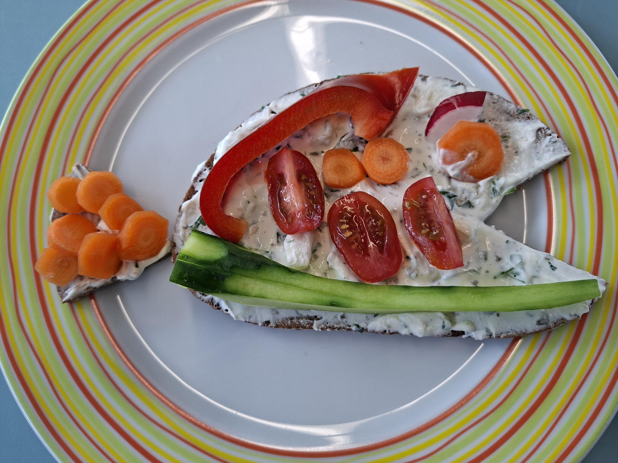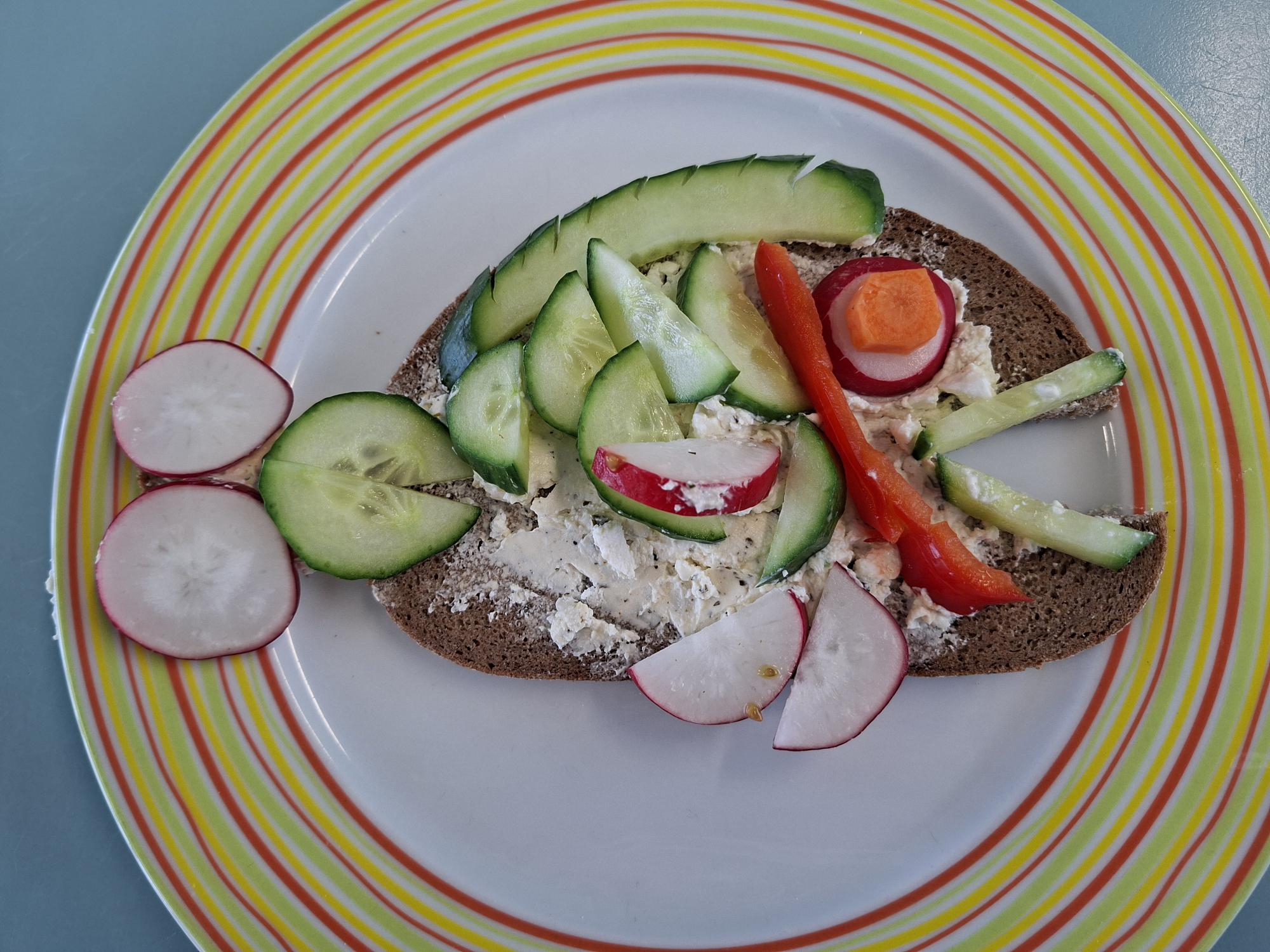 Dazu schnitten sie verschiedenes Gemüse und übten dabei das sichere Schneiden. Anschließend gestalteten sie daraus lustige Pausenbrote.